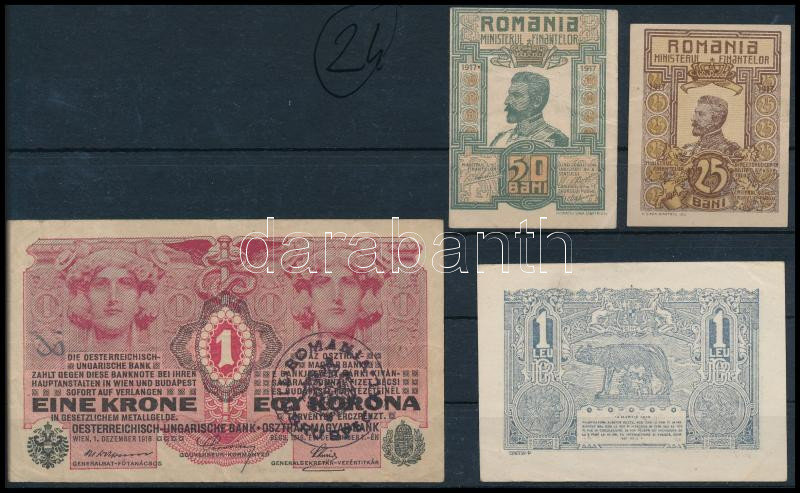Romania 1915. 1 Leu with Romanian overprint + 1917. 25 Bani + 50 Bani + Hungary 1916. 1 Korona with Romania overprint C:F