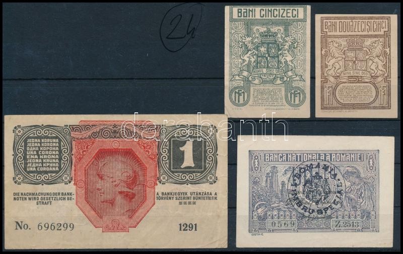 Románia 1915. 1L román felülbélyegzéssel + 1917. 25b + 50b + Magyarország 1916. 1K román felülbélyegzéssel T:III