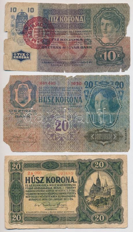 Leírás: 1913-1920. 8db-os vegyes magyar korona bankjegy tétel T:III-IV