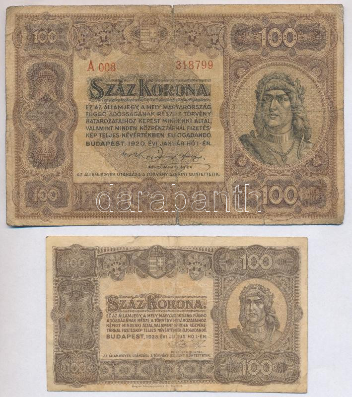Leírás: 1920. 100K "Orell Füssli Zürich" + 1923. 100K "Magyar Pénzjegynyomda Rt. Budapest" T:III,III- ly., szakadás
