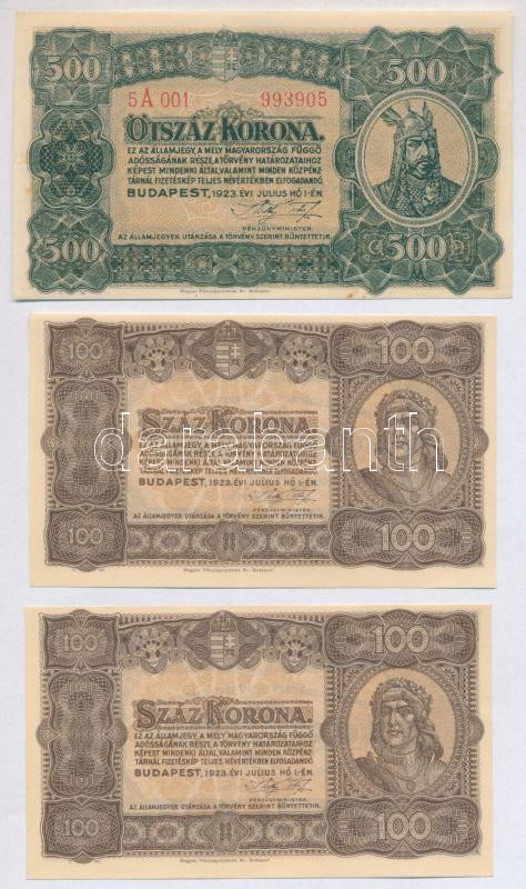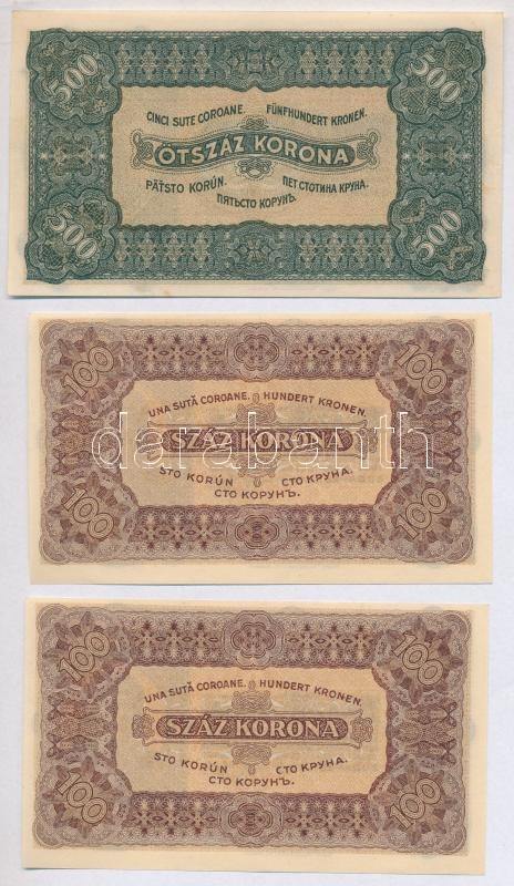 Leírás: 1920. 2K (2x) "2ab 135" csillagos sorszám, egy ugrással sorszámkövető + 1923. 100K (2x) számozás nélkül, "Magyar Pénzjegynyomda Rt. Budapest" nyomdahely jelöléssel + 1923. 500K "Magyar Pénzjegynyomda Rt. Budapest" nyomdahely jelöléssel T:I-II