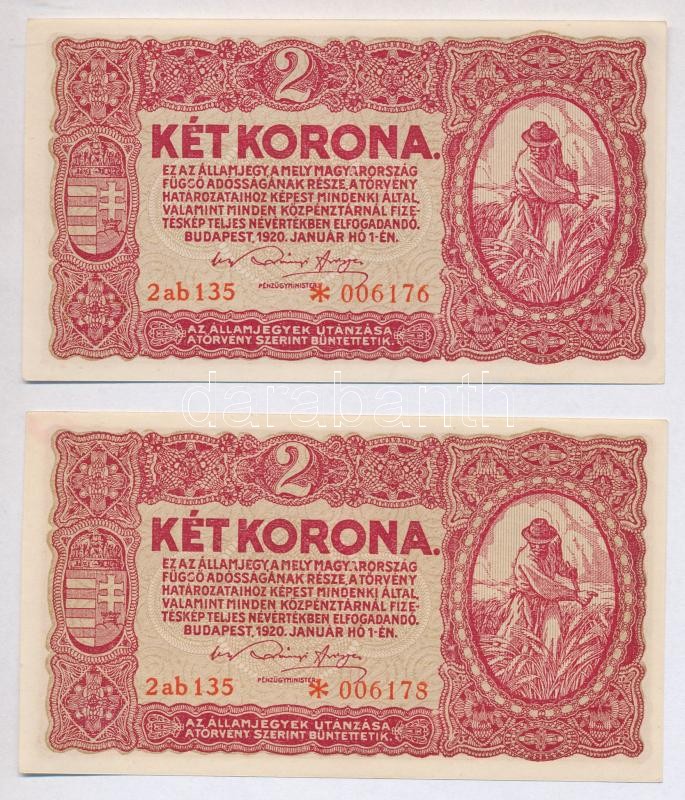 1920. 2K (2x) "2ab 135" csillagos sorszám, egy ugrással sors... https://www.darabanth.com/hu/287-Gyorsarveres/287.0/Numizmatika/Magyar-bankjegyek~500002/1920-2K-2x-2ab-135-csillagos-sorszam-egy-ugrassal-sorszamkoveto-plus-1923-100K-2x-szamoz~II1506727