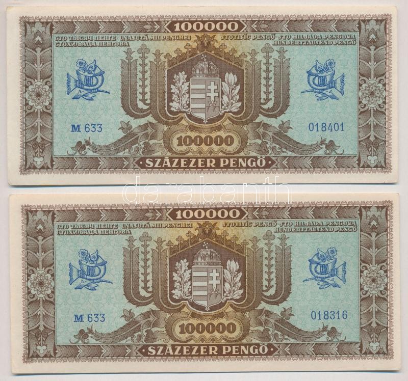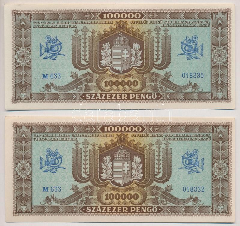 Leírás: 1945. 100.000P (4x) II. kiadás kék sorozat és sorszám, "M633" sorozat, közte közeli sorszámok T:I-