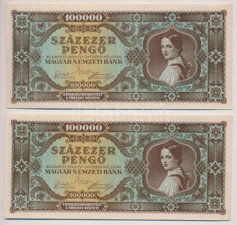 1945. 100.000P (4x) II. kiadás kék sorozat és sorszám, "M633"... https://www.darabanth.com/hu/287-Gyorsarveres/287.0/Numizmatika/Magyar-bankjegyek~500002/1945-100000P-4x-II-kiadas-kek-sorozat-es-sorszam-M633-sorozat-kozte-kozeli-sorszamok~II1506427