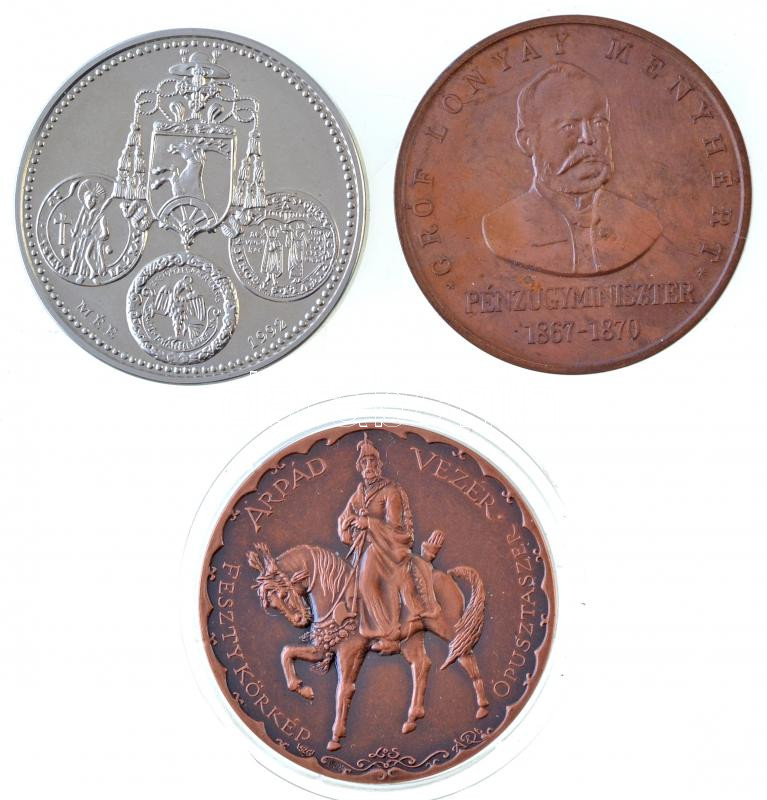 Leírás: Bognár György (1944-) / Szabó Zoltán 1992. "Bakócz Tamás / MÉE" Ni emlékérem tokban (42,5mm) + 1996. "Árpád vezér - Feszty-körkép, Ópusztaszer / B.U.É.K." Br emlékérem (42,5mm) + 1992. "Gróf Lónyay Menyhért pénzügyminiszter / A Pénzügyminisztérium megalakulásának 125. évfordulójára" Br emlékérem tokban (42,5mm) T:1-2