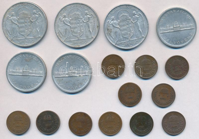 1926-1940. 2f (11xklf) + 1943. 5P (3x) 1945. 2P Al (3x) T:2-3 https://www.darabanth.com/hu/287-Gyorsarveres/287.0/Numizmatika/Magyar-es-magyar-verdejelu-fem-es-ezustpenzek~500003/1926-1940-2f-11xklf-plus-1943-5P-3x-1945-2P-Al-3x-T2-3~II1509800