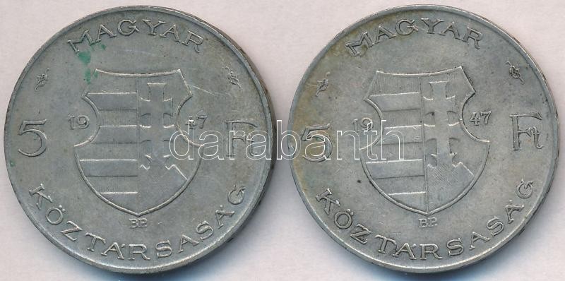 1947. 5Ft Ag "Kossuth" (2x) T:2-,3 https://www.darabanth.com/hu/287-Gyorsarveres/287.0/Numizmatika/Magyar-es-magyar-verdejelu-fem-es-ezustpenzek~500003/1947-5Ft-Ag-Kossuth-2x-T2-3~II1510220
