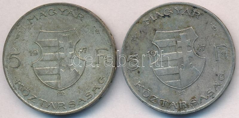 1947. 5Ft Ag "Kossuth" (2x) T:2- patina https://www.darabanth.com/hu/287-Gyorsarveres/287.0/Numizmatika/Magyar-es-magyar-verdejelu-fem-es-ezustpenzek~500003/1947-5Ft-Ag-Kossuth-2x-T2-patina~II1510208