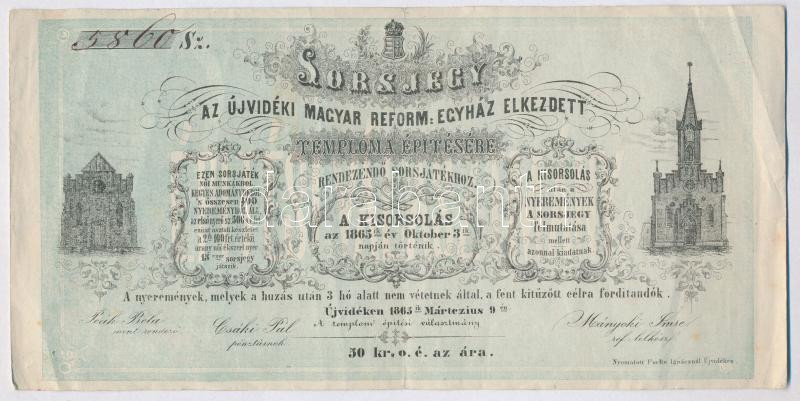 Újvidék 1865. "Az újvidéki magyar reformegyház elkezdett temploma építésére" sorsjegy, kézi sorszámmal T:III