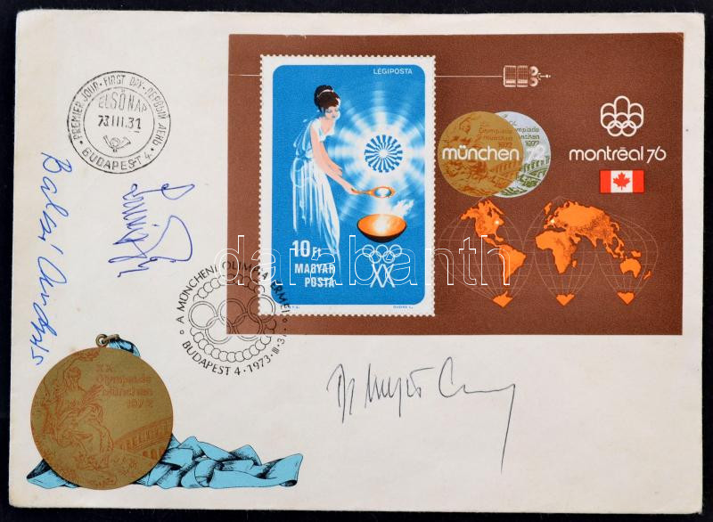 1972 München olimpia aranyérmeseinek Balczó András (1938-), Schmitt Pál (1942-), Hegedűs Csaba (1948-) aláírásai egy Müncheni olimpiai borítékon, az olimpia első napja (73. III. 31.) bélyegzéssel.