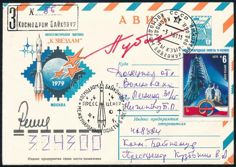 Alekszej Gubarev (1931-2015) szovjet és Vladimír Remek (1948- ) cseh űrhajósok aláírásai emlékborítékon /