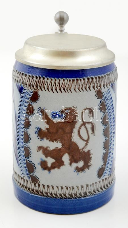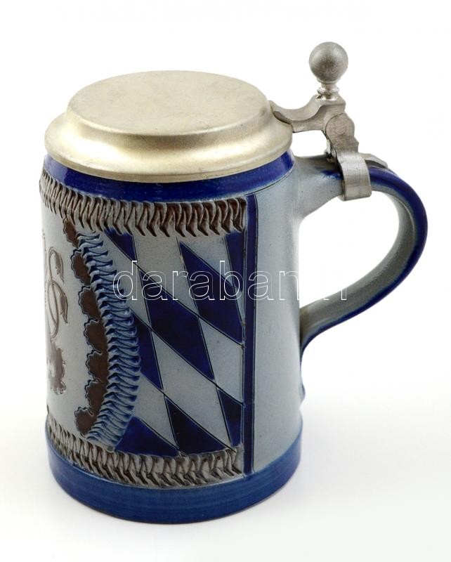 Leírás: Alumínium fedeles sörös korsó, festett kerámia, jelzett, hibátlan, m:15 cm