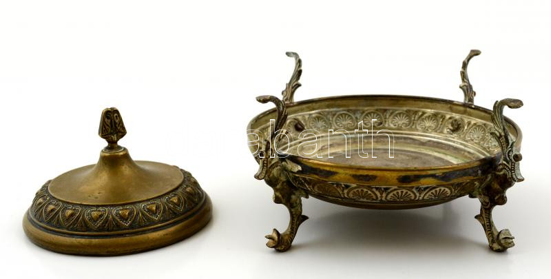 Leírás: Aranyozott alpakka kínáló tál, díszítésekkel, üveg nélkül. Hozzá egy tető