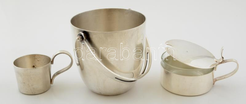 Leírás: Kis fém tétel, jelzettek: kisméretű pezsgősvödör, d: 12,5 cm; mérőedényke, d: 6 cm; hamutartó üveg betéttel, d: 9 cm