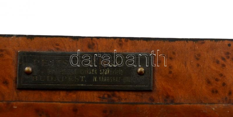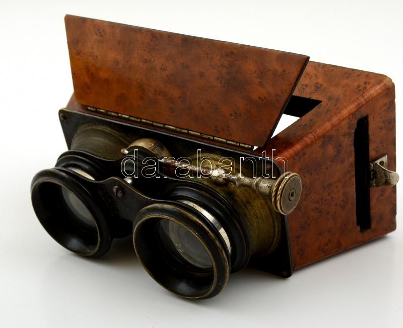 Nagyméretű fa sztereo-kép nézegető, Pejtsik Károly fotóüzlete, két modern fotóval, és egy régi üveg fotóval, kissé megviselt állapotban, az egyik lencse laza, kis hiánnyal, 16x10x9 cm. / Vintage wood stereo viewer, with two modern photos, and one old glass photo, little bit poor condition, one lens is loose, with some lack, 16x10x9 cm.