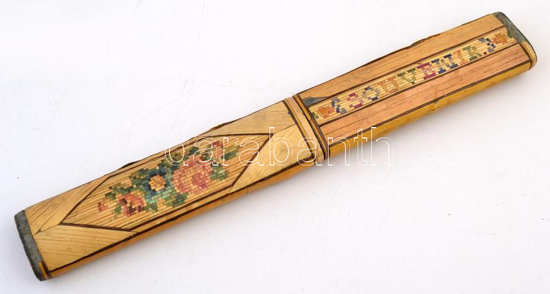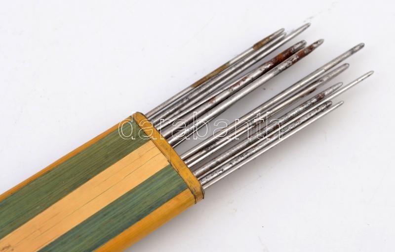 Leírás: Régi fa borítású mozaik mintás kötőtű tartódoboz, kötőtűkkel, kisebb sérülésekkel. 20,5x2,5 cm