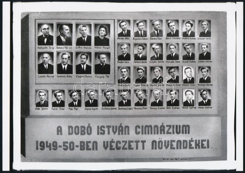 1950 Eger, Dobó István Gimnázium tanári kara és végzett növendékei, kistabló 37 nevesített portréval, Gráf fényképész műtermében készült üveglemez negatív mai nagyítása, 18x25 cm