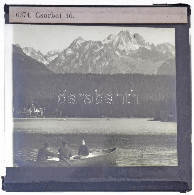 Leírás: Csorbai-tó, Magas-tátra, üvegdia, kis sérüléssel, 8x8 cm./ Štrbské pleso, High Tatras, glass slide, with little damage, 8x8 cm.