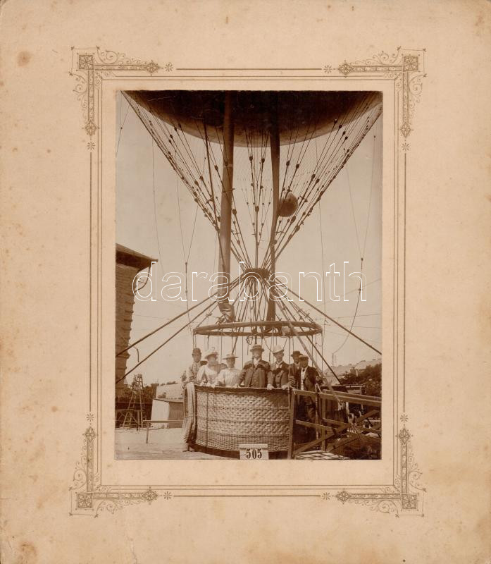 cca 1900 'Az 505 léghajó' utasai, illusztrált kartonlapon, 16x12 cm. https://www.darabanth.com/hu/288-Gyorsarveres/288.0/Festmeny-mutargy-papirregiseg-egyeb/Foto~19/cca-1900-Az-505-leghajo-utasai-illusztralt-kartonlapon-16x12-cm~II1515964