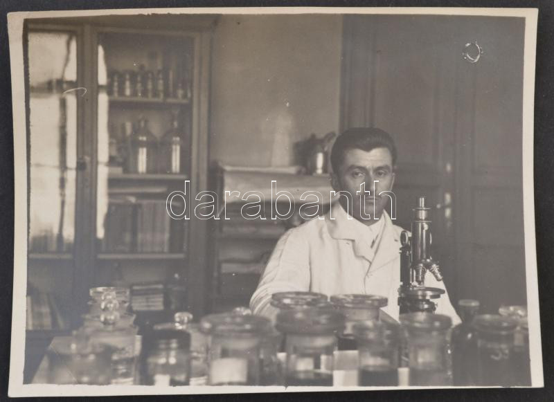 Leírás: cca 1925 dr. Kiss Ferenc anatómia professzor (1889-1966) laboratóriumában. 11x8 cm