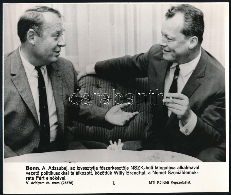 cca 1965 Bonn. A. Adzsubej az Izvesztyija főszerkesztője Willy Brandttal a Német Szociáldemokrata Párt elnökével találkozik, MTI fotó, feliratozva, 17x24 cm