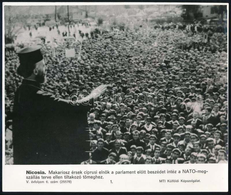 Leírás: cca 1965 Nicosia. Makariosz érsek ciprusi elnök a parlament előtti beszéde, MTI fotó, feliratozva, 17x24 cm