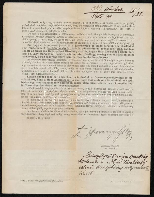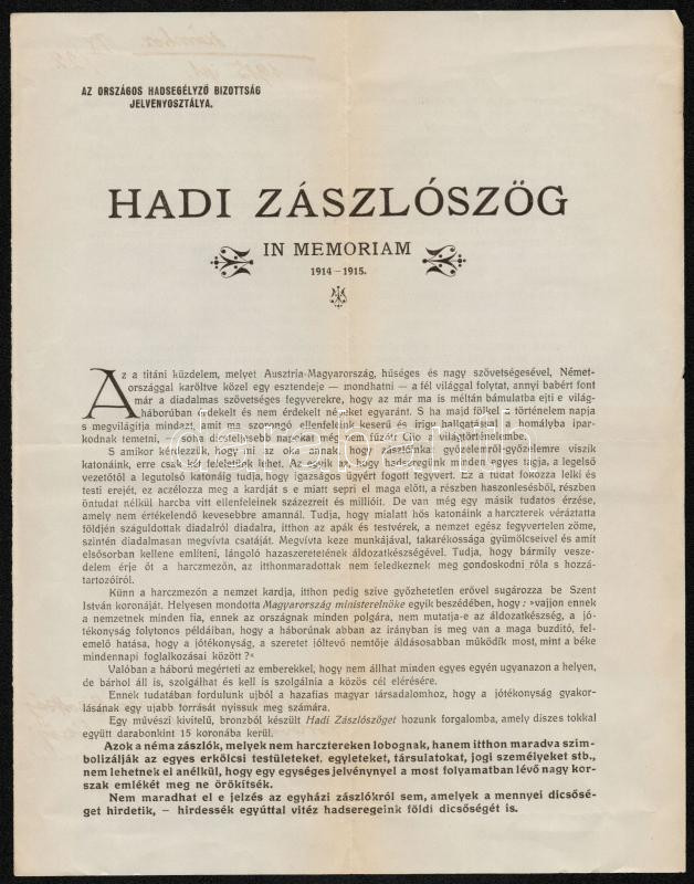 1915 Hadi Zászlószög, Országos Hadsegélyező Bizottság Jelvényosztályán... https://www.darabanth.com/hu/288-Gyorsarveres/288.0/Festmeny-mutargy-papirregiseg-egyeb/Militaria~25/1915-Hadi-Zaszloszog-Orszagos-Hadsegelyezo-Bizottsag-Jelvenyosztalyanak-felhivasa-Pest~II1514362
