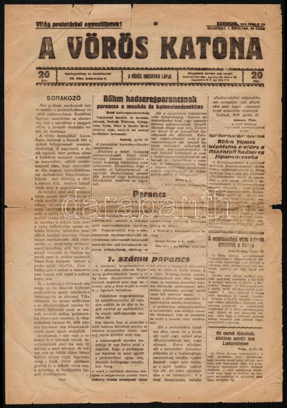 1919 A vörös katona, I. évfolyam, 26. szám, 1919. Április 23., megvise... https://www.darabanth.com/hu/288-Gyorsarveres/288.0/Festmeny-mutargy-papirregiseg-egyeb/Militaria~25/1919-A-voros-katona-I-evfolyam-26-szam-1919-Aprilis-23-megviselt-szakadozott-allapot~II1514382