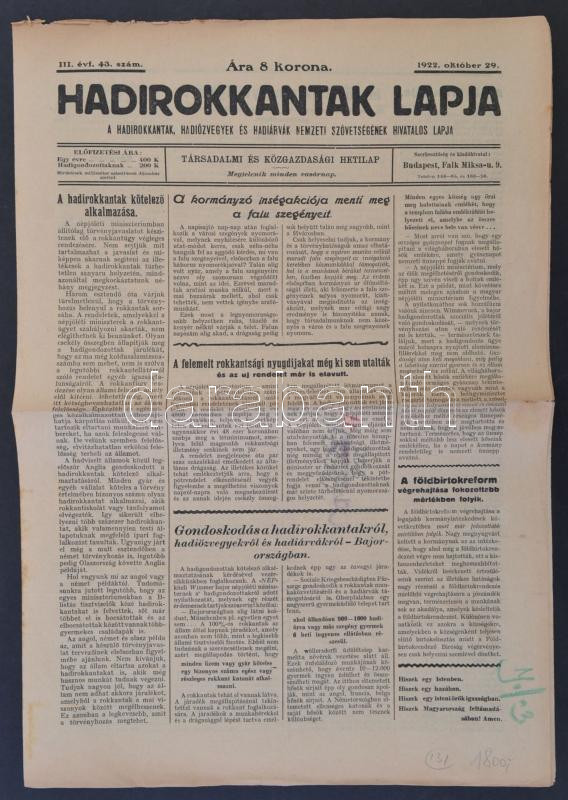 Leírás: 1922 A Hadirokkantak lapja, a hadirokkantak, hadiözvegyek és hadiárvák nemzeti szövetségének hivatalos lapja III. évfolyamának 43. száma