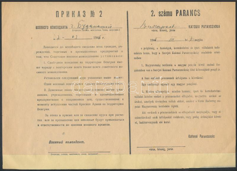 Leírás: 1945 Budapest katonai parancsnokának 2. számú parancsa, 1945. III. 7., magyar és orosz nyelven, az alján javítással, 29x21 cm.