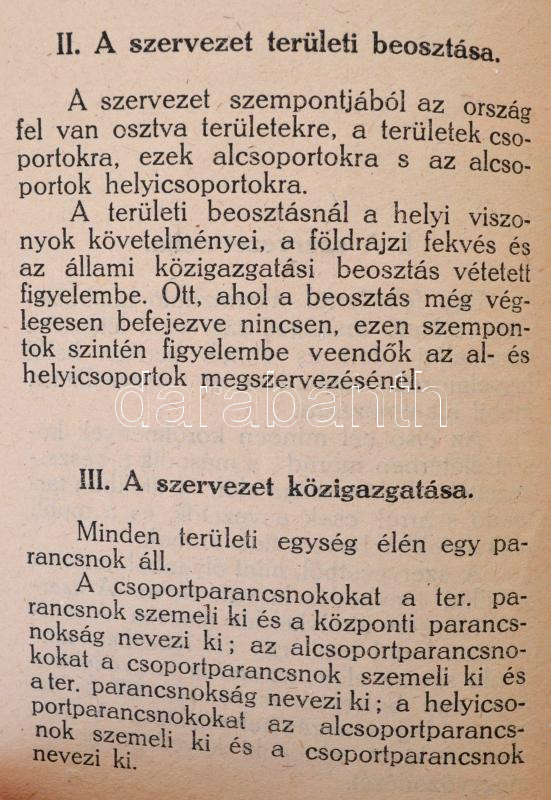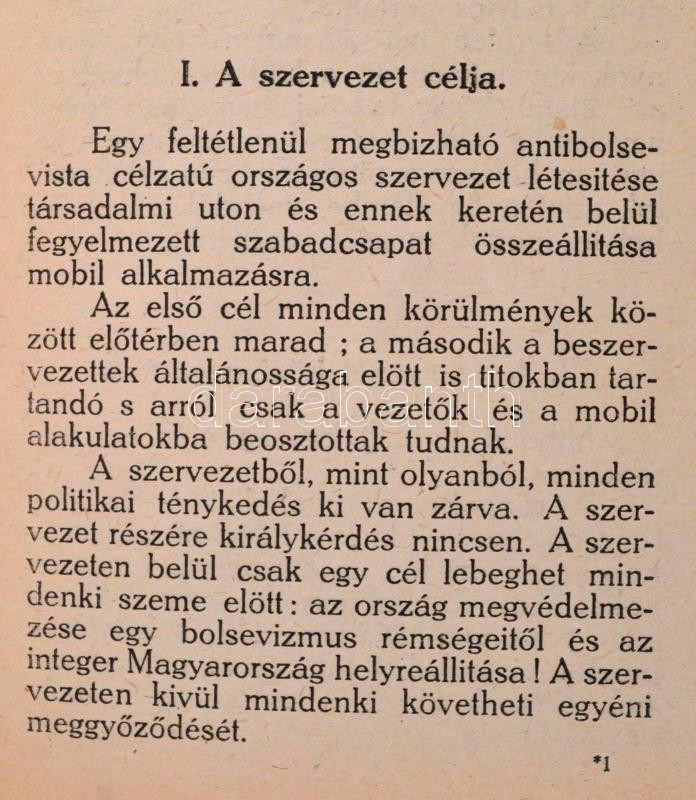 Leírás: 1922 Szervezeti utasítás. Bp., Sajtótanfolyam Kisérleti Nyomdája, 34 p. Kiadói tűzött papírkötés. Antibolsevista félkatonai szervezet szervezeti utasítása. Jó állapotban.