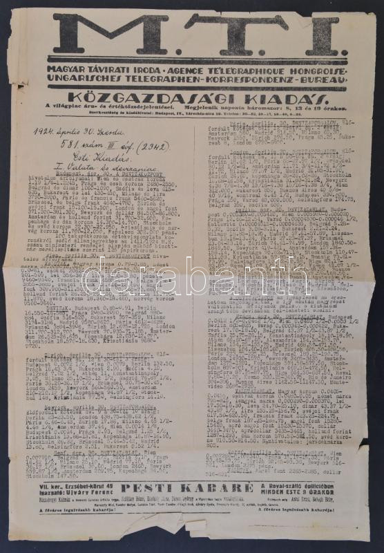 Leírás: 1924 M.T.I. Magyar Távirati Iroda közgazdasági kiadás, Szerk.:Zimmer Ferenc, III. évf. 581. szám., 1924. ápr. 30., esti kiadás, megviselt, szakadozott állapotban.