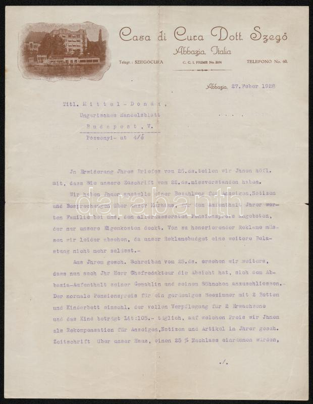 1928 Casa di Cura Dott Szegő, Abbazia, Italia, díszes fejléces levélpa... https://www.darabanth.com/hu/288-Gyorsarveres/288.0/Festmeny-mutargy-papirregiseg-egyeb/Nyomtatvanyok~27/1928-Casa-di-Cura-Dott-Szego-Abbazia-Italia-diszes-fejleces-levelpapir-nemet-nyelvu-gepe~II1514339