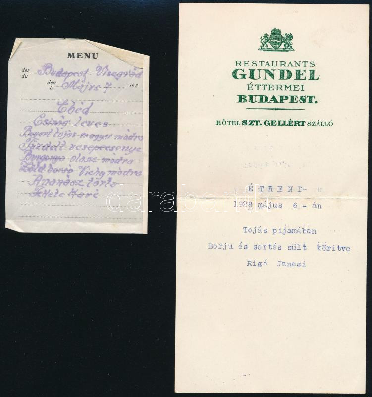 1928 Gundel Étterem étrendkártyája, és menu papírja. https://www.darabanth.com/hu/288-Gyorsarveres/288.0/Festmeny-mutargy-papirregiseg-egyeb/Nyomtatvanyok~27/1928-Gundel-Etterem-etrendkartyaja-es-menu-papirja~II1513865