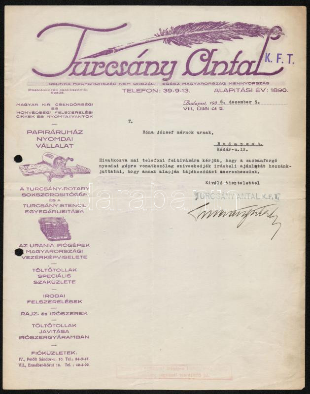 1936 Turcsány Antal Kft, díszes fejléces levélpapír, aláírással. https://www.darabanth.com/hu/288-Gyorsarveres/288.0/Festmeny-mutargy-papirregiseg-egyeb/Nyomtatvanyok~27/1936-Turcsany-Antal-Kft-diszes-fejleces-levelpapir-alairassal~II1514313