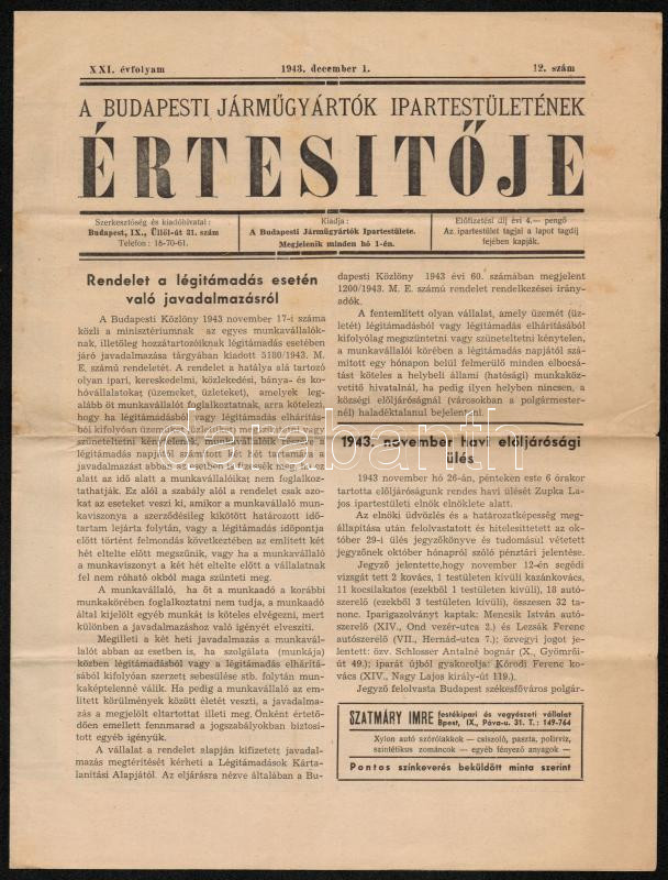 1943 A Budapesti Járműgyártók Ipartestületének Értesítője, XXI. évf. 1... https://www.darabanth.com/hu/288-Gyorsarveres/288.0/Festmeny-mutargy-papirregiseg-egyeb/Nyomtatvanyok~27/1943-A-Budapesti-Jarmugyartok-Ipartestuletenek-Ertesitoje-XXI-evf-12-szam-1943-dec~II1514526