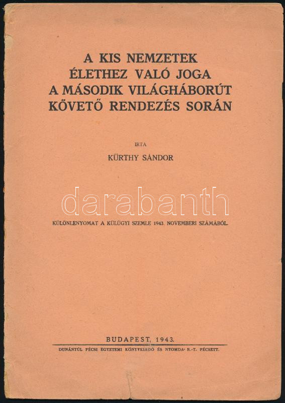 1943 Bp., Kürthy Sándor: A kis nemzetek élethez való joga a második vi... https://www.darabanth.com/hu/288-Gyorsarveres/288.0/Festmeny-mutargy-papirregiseg-egyeb/Nyomtatvanyok~27/1943-Bp-Kurthy-Sandor-A-kis-nemzetek-elethez-valo-joga-a-masodik-vilaghaborut-koveto-re~II1516708