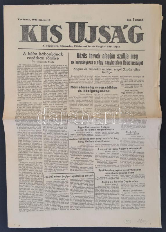 Leírás: 1945 A Kis Újság, a Független Kisgazda-, Földmunkás- és Polgári Párt Lapja május 13-diki száma