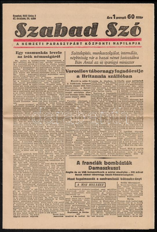 1945 A Szabad Szó, a Nemzeti Parasztpárt Központi Lapja 47. évfolyamán... https://www.darabanth.com/hu/288-Gyorsarveres/288.0/Festmeny-mutargy-papirregiseg-egyeb/Nyomtatvanyok~27/1945-A-Szabad-Szo-a-Nemzeti-Parasztpart-Kozponti-Lapja-47-evfolyamanak-54-szama-hatoldalC3~II1516024