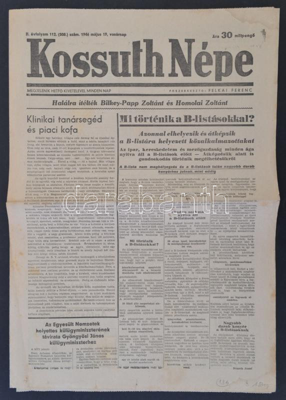 1946 A Kossuth Népe II. évfolyamának 112. száma, címlapon a B-listások... https://www.darabanth.com/hu/288-Gyorsarveres/288.0/Festmeny-mutargy-papirregiseg-egyeb/Nyomtatvanyok~27/1946-A-Kossuth-Nepe-II-evfolyamanak-112-szama-cimlapon-a-B-listasokrol-szolo-hirrel~II1516062