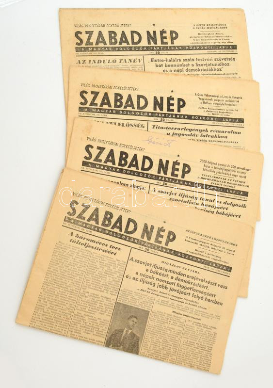 1949 Szabad Nép, 1949. szeptember 6-8., szeptember 10., VII. évfolyam ... https://www.darabanth.com/hu/288-Gyorsarveres/288.0/Festmeny-mutargy-papirregiseg-egyeb/Nyomtatvanyok~27/1949-Szabad-Nep-1949-szeptember-6-8-szeptember-10-VII-evfolyam-206-208-210-szamok-Jo-~II1512556