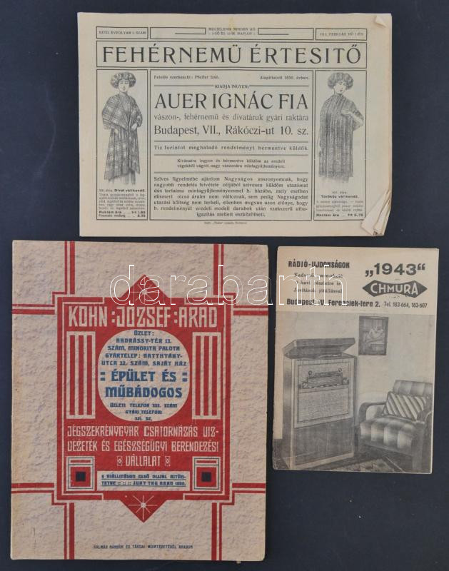 cca 1900-1943 3 db reklám katalógus és árjegyzék: Kohn József Arad épület és műbádogos katalógusa, 1911 Fehérnemű értesítő, Auer Ignác Fia üzletének katalógusa, 1943. évi rádió árjegyzék.