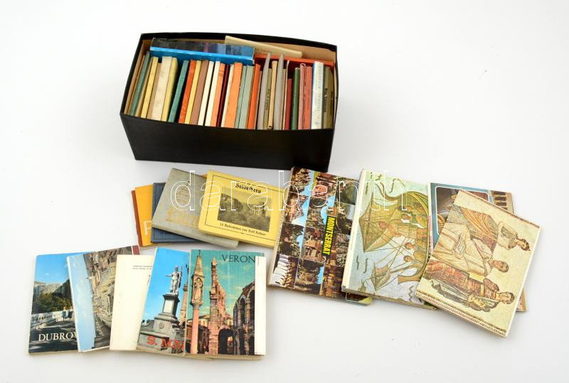 Leírás: cca 1920-1960 Kb 50 db, nagyrészt háború előtti kis képes leporelló különféle külföldi városokról. / Mostly pre-war leporellos, photo series.