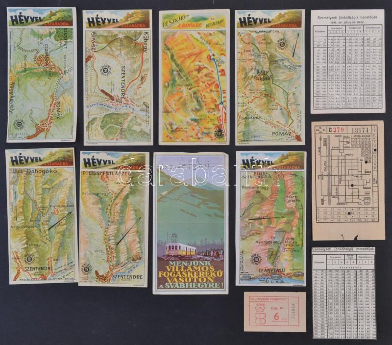 Leírás: cca 1930-1940 12 db közlekedéssel kapcsolatos nyomtatvány: 'Hévvel a szabadba' számolócédulák, jegyek, menetdíj táblázatok.
