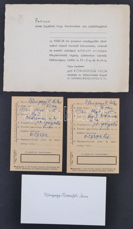 cca 1930-1940 gróf Königsegg család kis vegyes okmány és nyomtatvány tétel, 4 db: Königsegg Júlia régiség és lakberendezési tárgyak kereskedő reklámlapja, Königsegg-Rottenfels János névkártyája, Königsegg-Rottenfels Miksa gépkocsi betétlapja