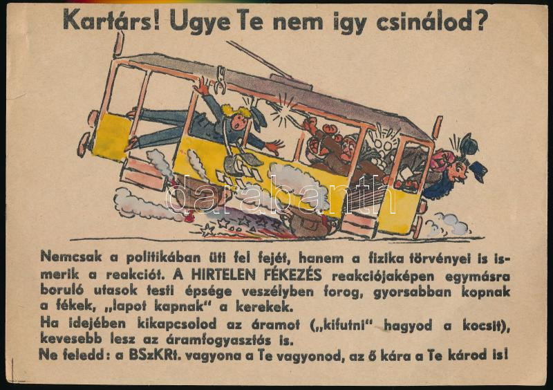 Leírás: cca 1940 "Kartárs! Ugye Te nem igy csinálod?", BSzKrt figyelmzetető prospektus.