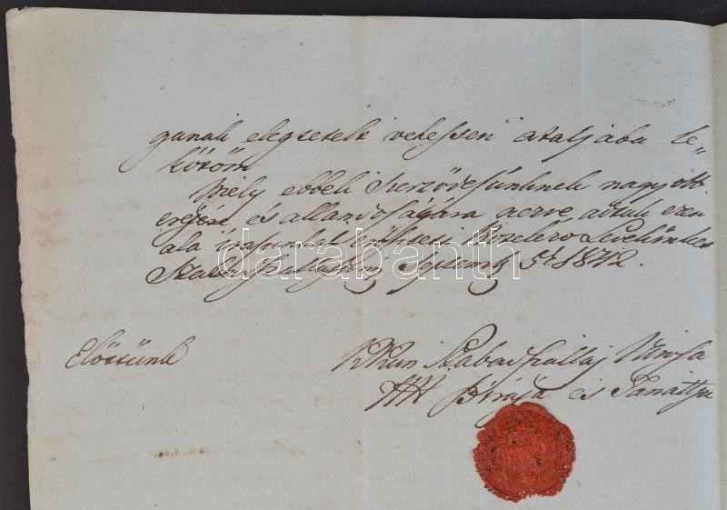 Leírás: 1845 Kiskunszabadszállás város szerződése helyi boltossal. A városi elöljárók aláírásával és a város címeres pecsétjével