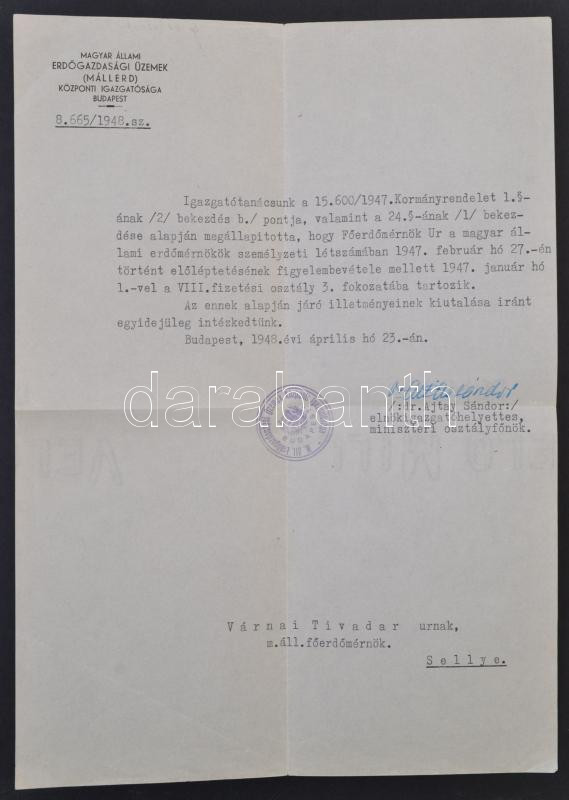 1948 Magyar Állami Erdőgazdasági Üzemek (Mállerd) rendelkezése dr. Ajtay Sándor miniszteri osztályfőnök aláírásával, Várnai Tivadar főerdőmérnöknek címezve, pecséttel. 29,5x21 cm
