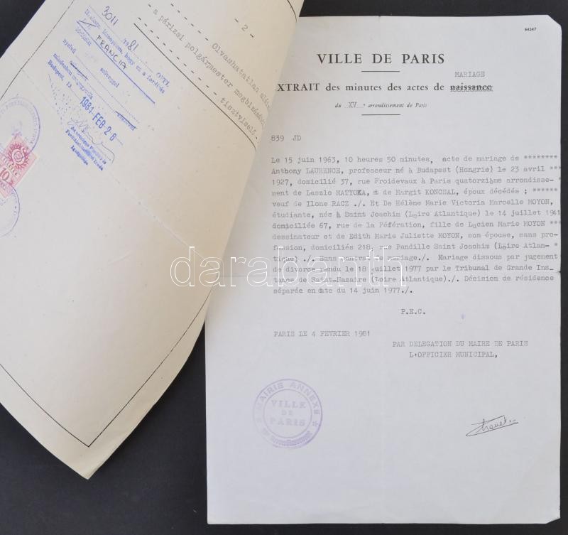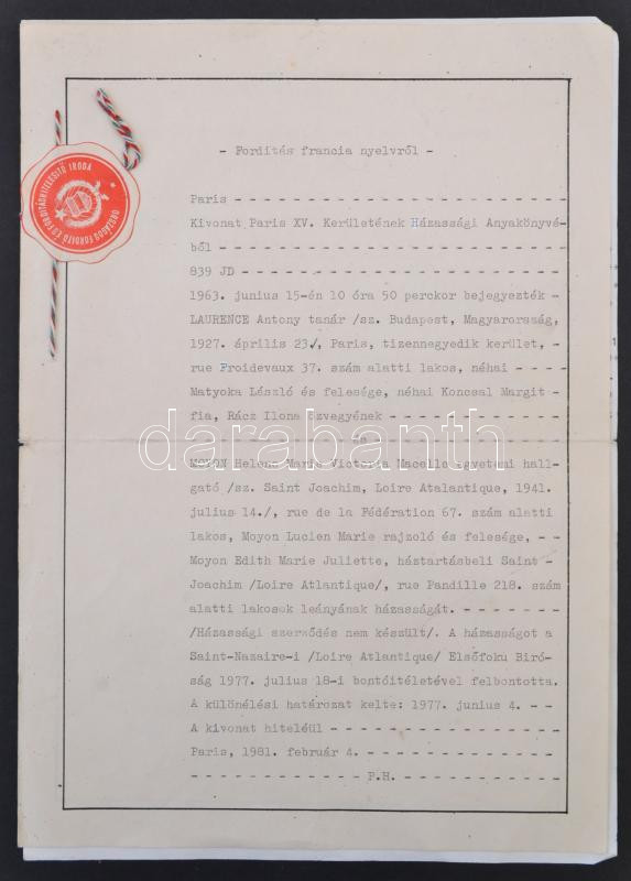 1981 Kivonat házassági anyakönyvből, Budapesten született francia egyetemi tanár házasságáról, hitelesített magyar fordítással és okmánybélyeggel. 29x21 cm