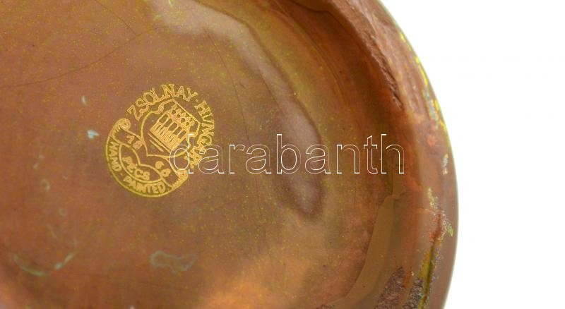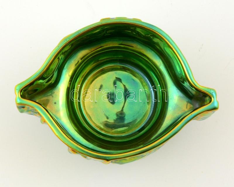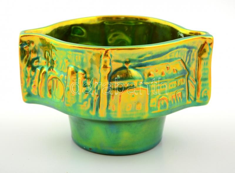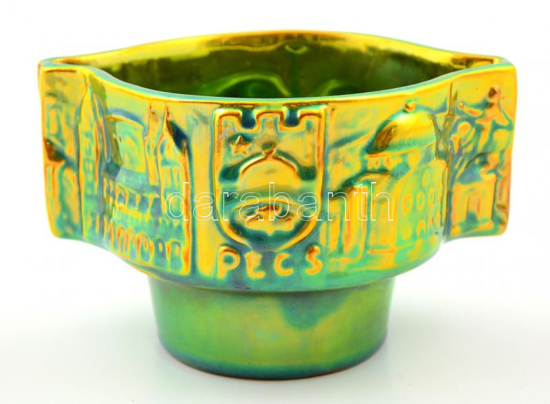 Leírás: Zsolnay eozin mázas tálka (Pécs nevezetességeivel), jelzett, hibátlan, 8×13 cm